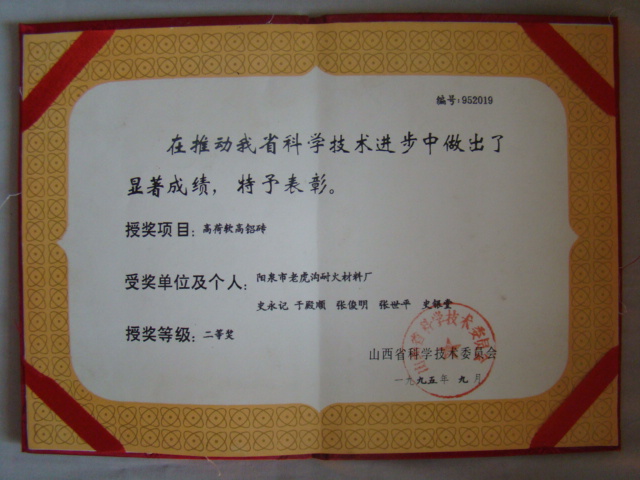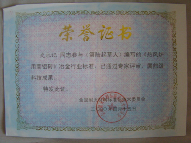 熱風(fēng)爐用低蠕變高鋁磚、高荷軟高鋁磚獲省科技進(jìn)步二等獎(jiǎng),微膨脹高鋁磚列入火炬計(jì)劃項(xiàng)目,炭素焙燒爐用特種高鋁磚已批準(zhǔn)國(guó)家專(zhuān)利