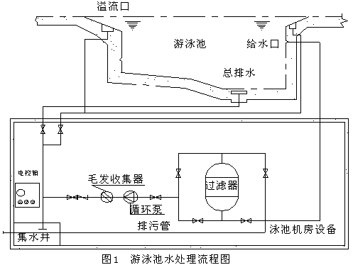 游泳池池水從池底部排水管和池岸溢水管流出,通過各控制閥門在機(jī)房匯合,經(jīng)投藥器加沉淀劑后,通過毛發(fā)收集器進(jìn)行粗過濾,然后再由水泵把水找入過濾器項部,水經(jīng)過過濾材料過濾后,從過濾器底部流出后的干凈水再經(jīng)過投藥泵加消毒劑后,由泳池池壁的給水口均勻注于池中,《游泳池水處理流程圖見下圖》